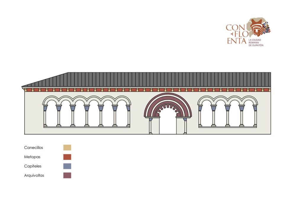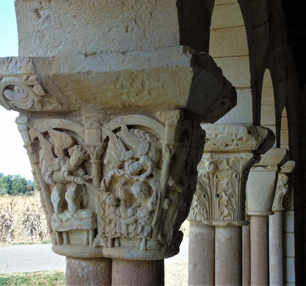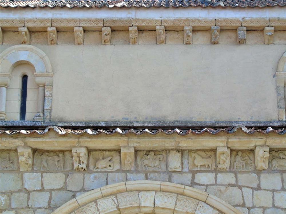 En el alero de la nave encontramos un magnífico conjunto de canecillos seguramente realizados por el mismo taller que elabora las portadas. Los motivos decorativos son variados, con motivos vegetales (cesteado, hoja picuda y helechos), animales (águila bicéfala, ave atrapando una serpiente, cánidos, bóvidos, peces y felinos), seres monstruosos (monstruo devorando a un personaje, grifos, arpías y sirenas) y personajes realizando alguna actividad (personaje con manto, personaje alzando las manos, personaje femenino durante el parto, juglar, bailarina, músico y abad u obispo). En este conjunto se despliega gran parte de los motivos decorativos presentes en San Martín y San Miguel de Fuentidueña.
