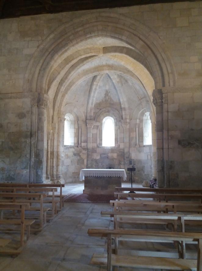 El tempo tiene planta basilical, con cabecera dividida en ábside y presbiterio. El primero, levantado en buena sillería, está cubierto con bóveda gallonada, cuyos nervios generan tres paños en la bóveda y el muro, apoyando en gruesas columnas, correspondidas al exterior con sendos contrafuertes prismáticos, que enmarcan las tres ventanas saeteras abocinadas con arcos lisos que descansan sobre columnillas monolíticas al interior y exterior.
