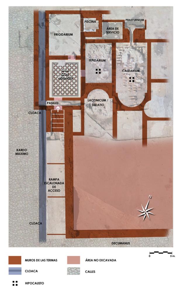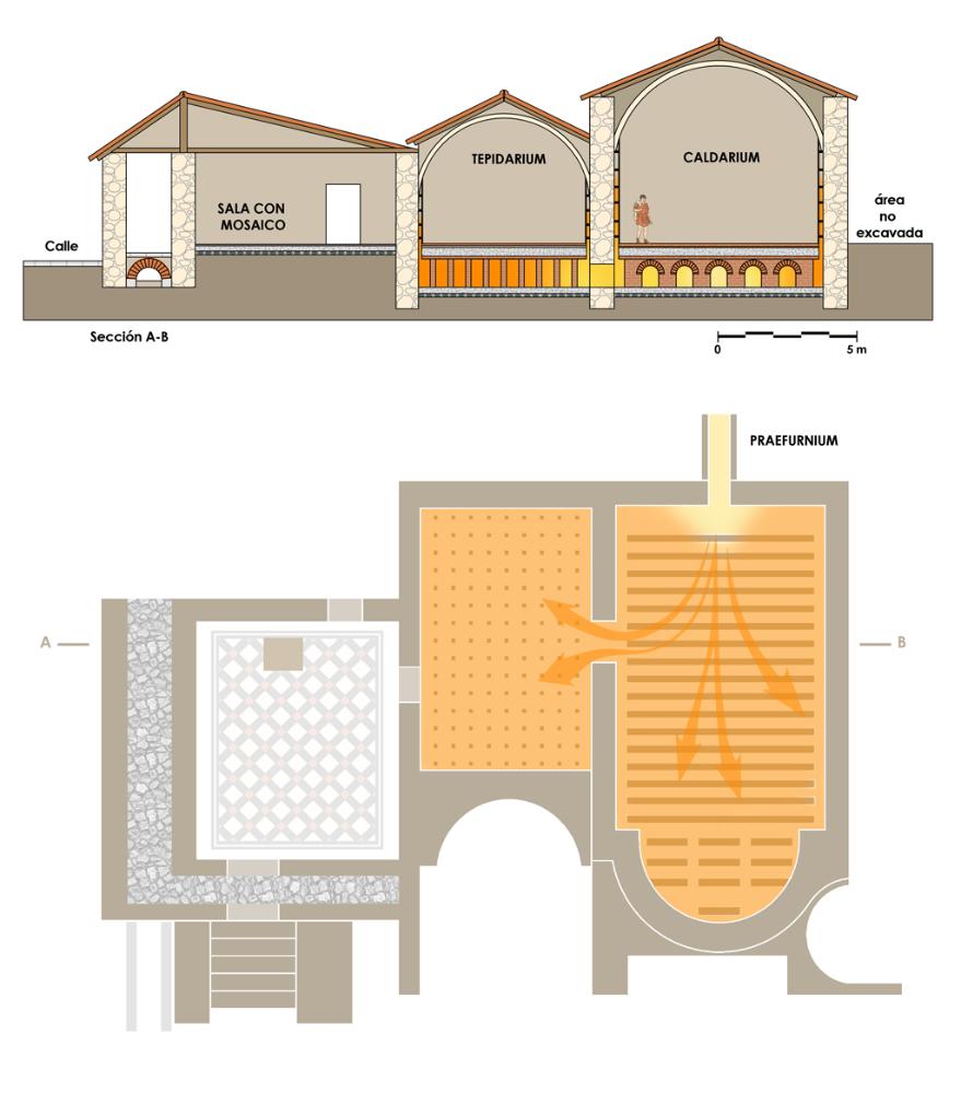 Desde la sala con mosaico se accedía también a las estancias calefactadas. Estas son dos y ambas cuentan con hypocaustum. El horno situado a los pies del caldarium servía para generar aire caliente que circulaba bajo el suelo a través de unas cámaras subterráneas, en los espacios entre las pilas de ladrillos (pilae) que soportaban los pavimentos. El hypocaustum del caldarium y el del tepidarium estaban comunicados, de este modo el aire caliente del horno pasaba el primer lugar a la sala de baños caliente (caldarium) y luego a la sala de baños templados (tepidarium). Sobre las pilae de ladrillo se colocaba la suspensura para apoyar el pavimento, en primer lugar se disponían unos grandes ladrillos sobre los que se vertía una capa de opus caementicium y por último el pavimento que iba a servir como superficie de tránsito, "cocciopesto" (pavimento hidráulico) en el tepidarium y losas de piedra en el caldarium.