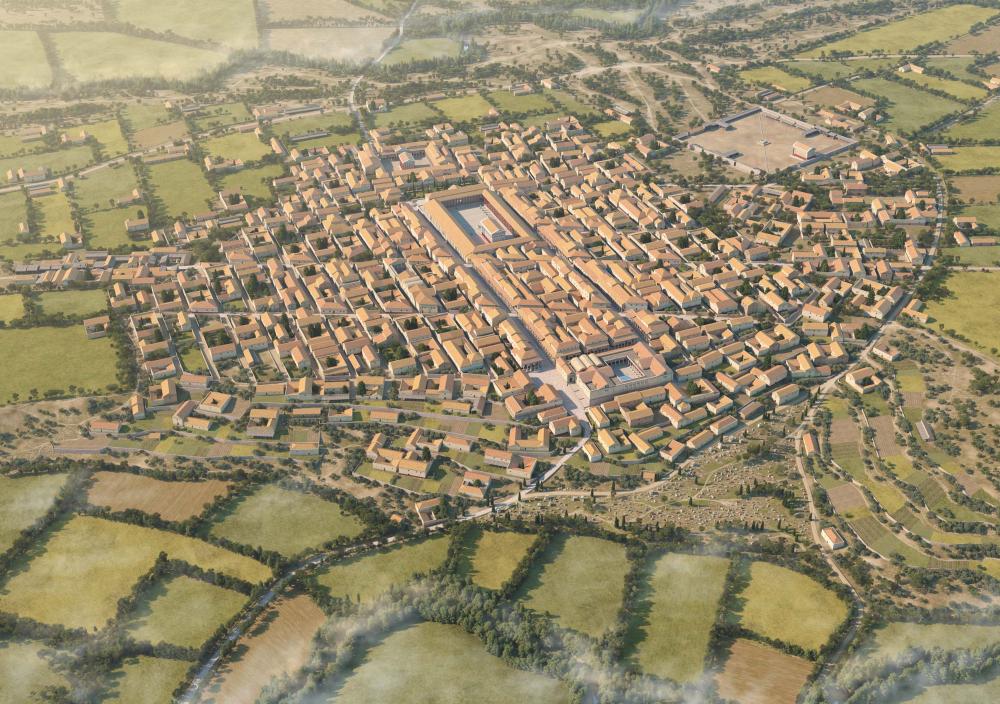 Más allá del núcleo central se advierten nuevos ejes viarios que, con orientación diferente a la retícula original, señalan áreas de expansión de la ciudad entre los siglos I y V d.C.